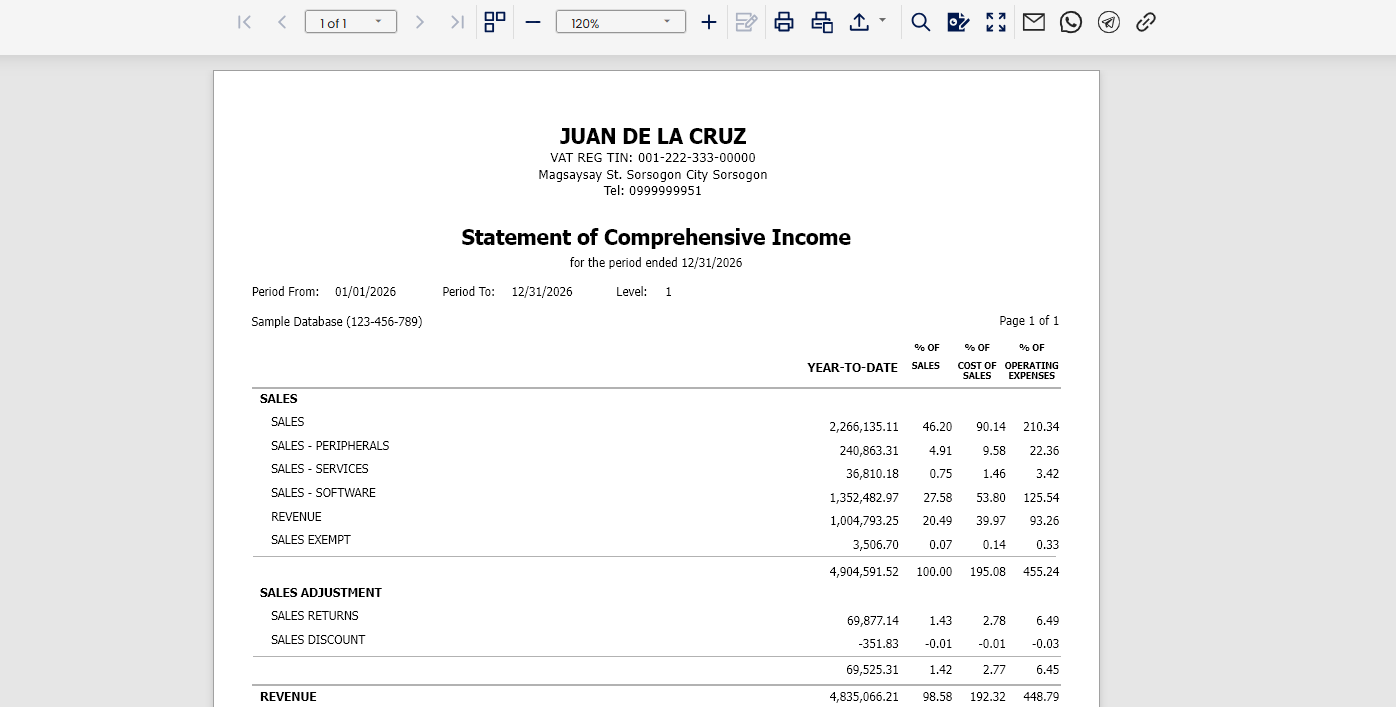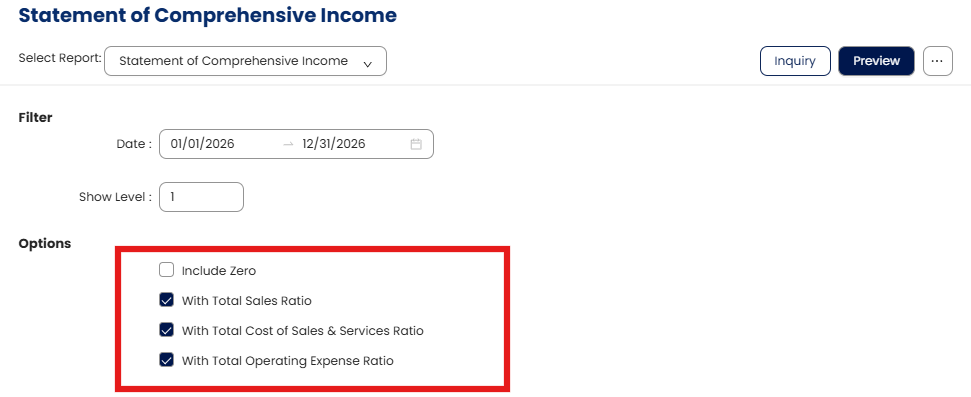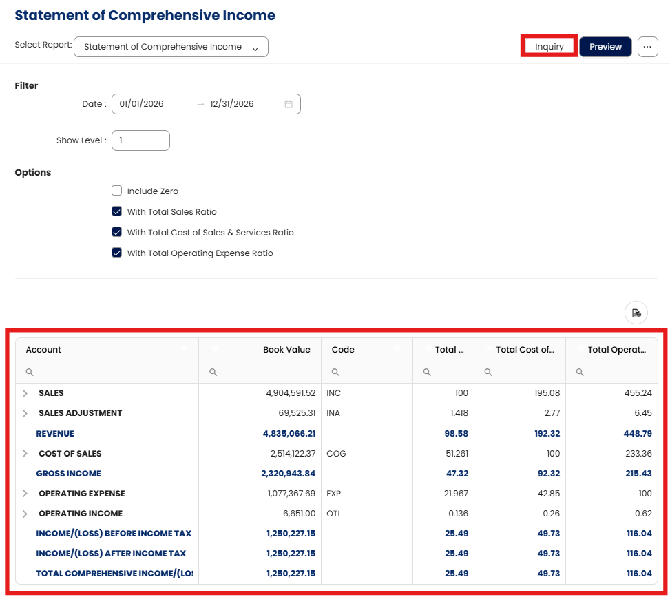 The Statement of Comprehensive Income now includes three additional ratio indicators that compare Cost of Sales, Cost of Services, and Operating Expenses to Total Income. These ratios provide a clearer view of cost behavior and profitability, helping users quickly assess whether expenses are increasing relative to income.