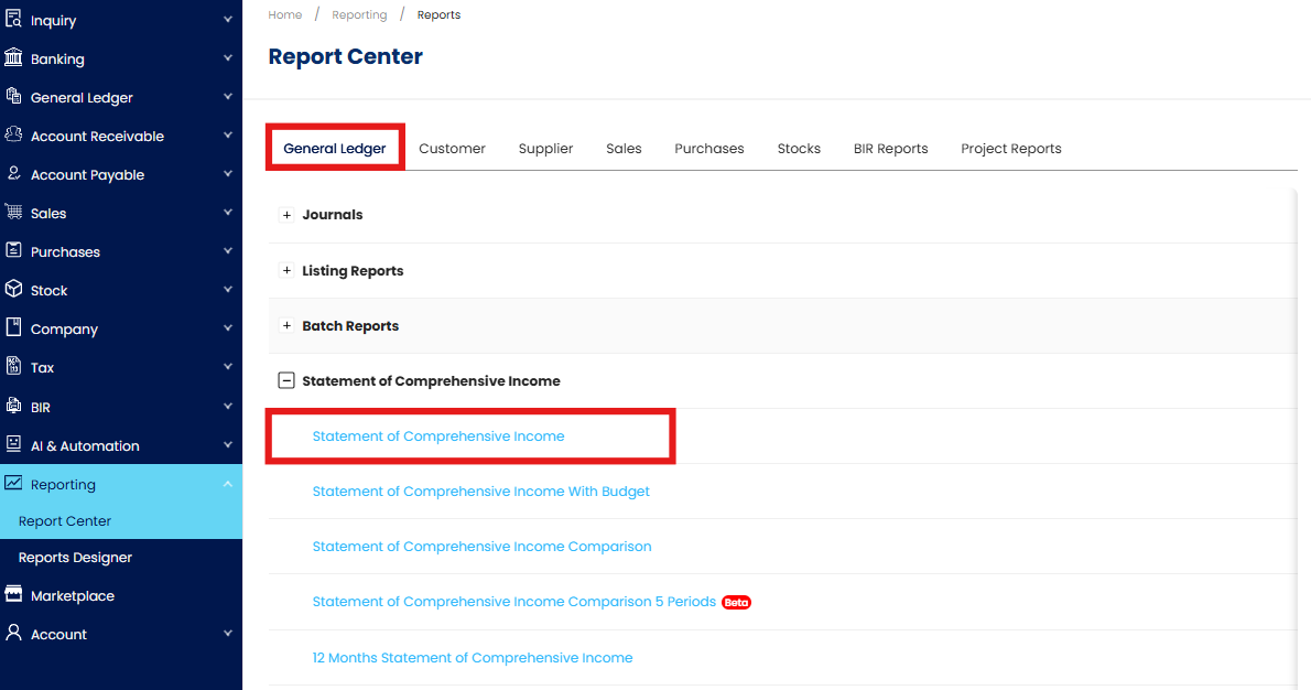Go to Reporting > Report Center > General Ledger > Statement of Comprehensive Income > Statement of Comprehensive Income