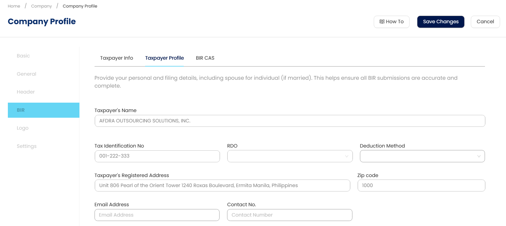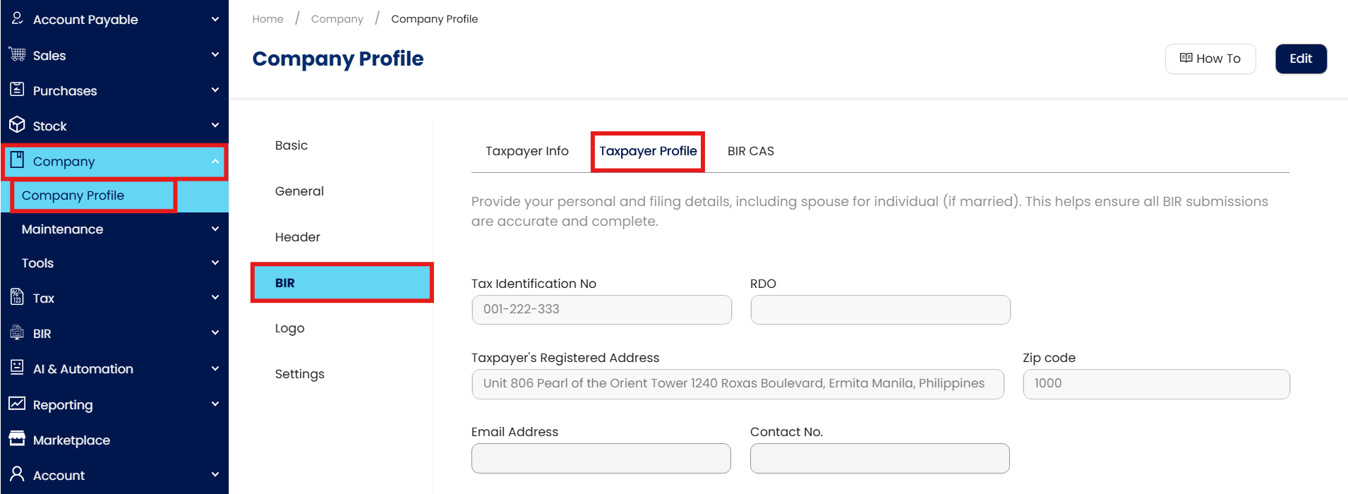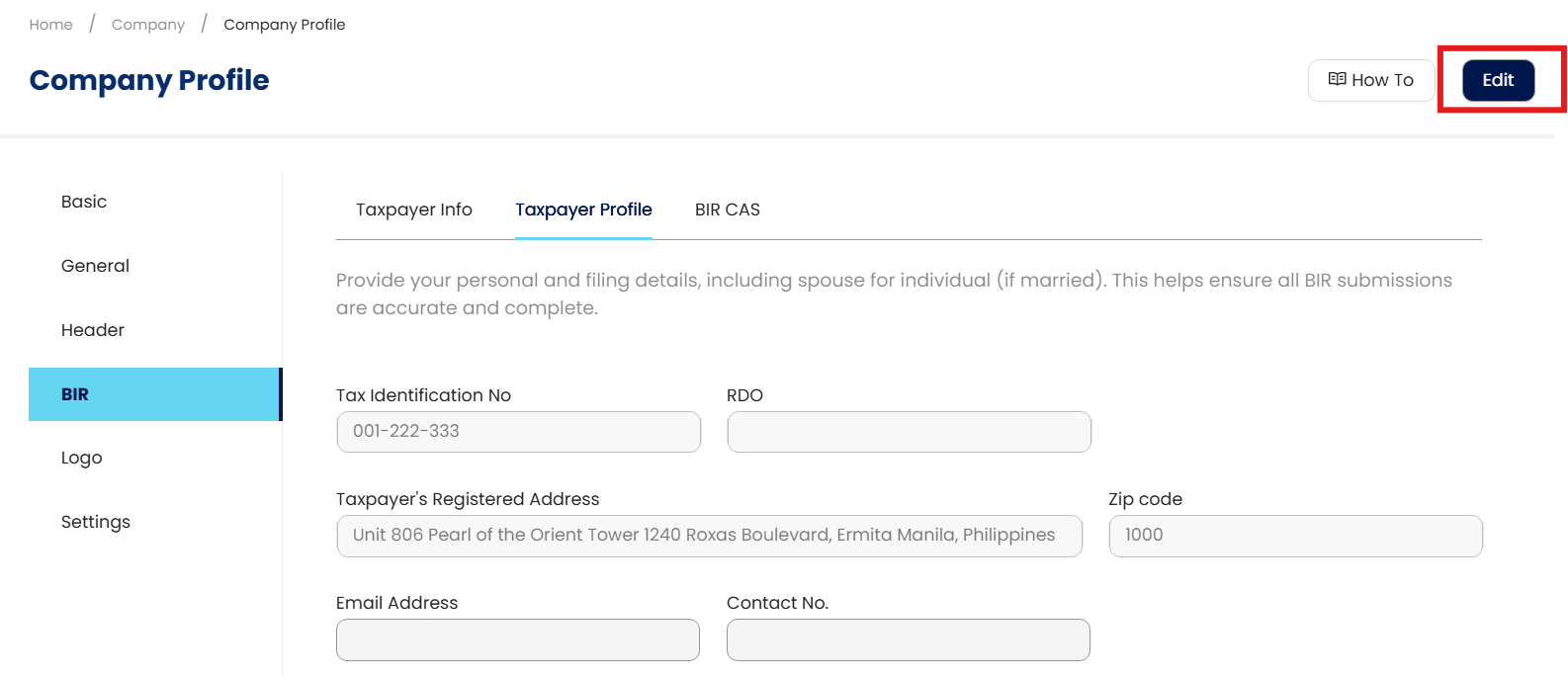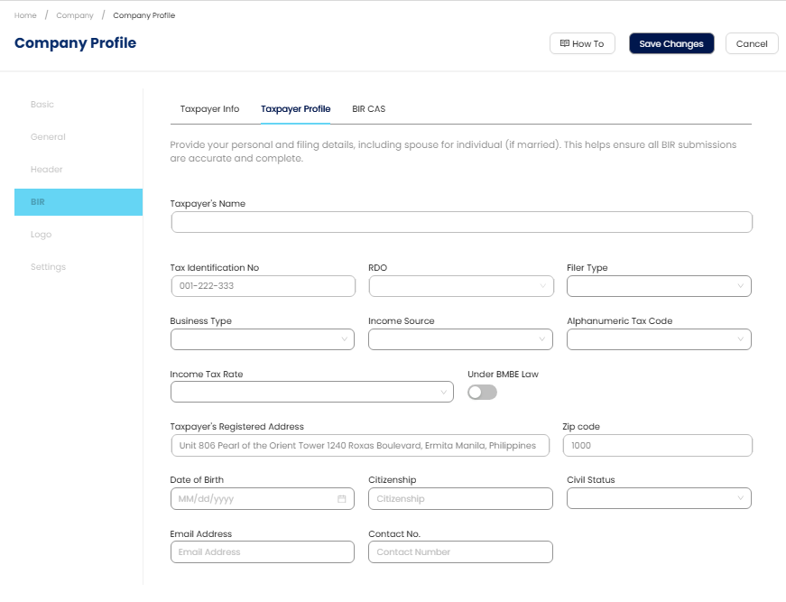 In the navigation pane, go to Company > Company Profile > BIR > Taxpayer Profile > Review the auto-populated fields sourced from the existing company and BIR Info setup details.
