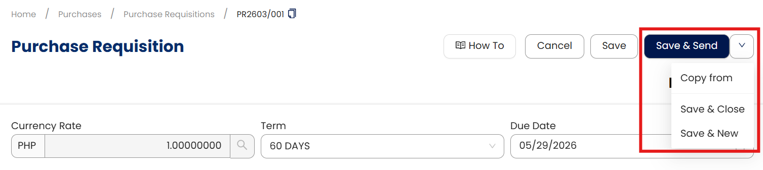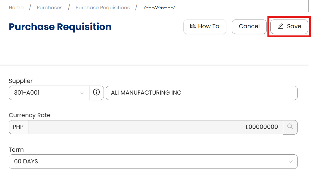 6. After saving, the Purchase Requisition will be recorded in the system and can be reviewed, approved, or converted into a Purchase Order when needed.