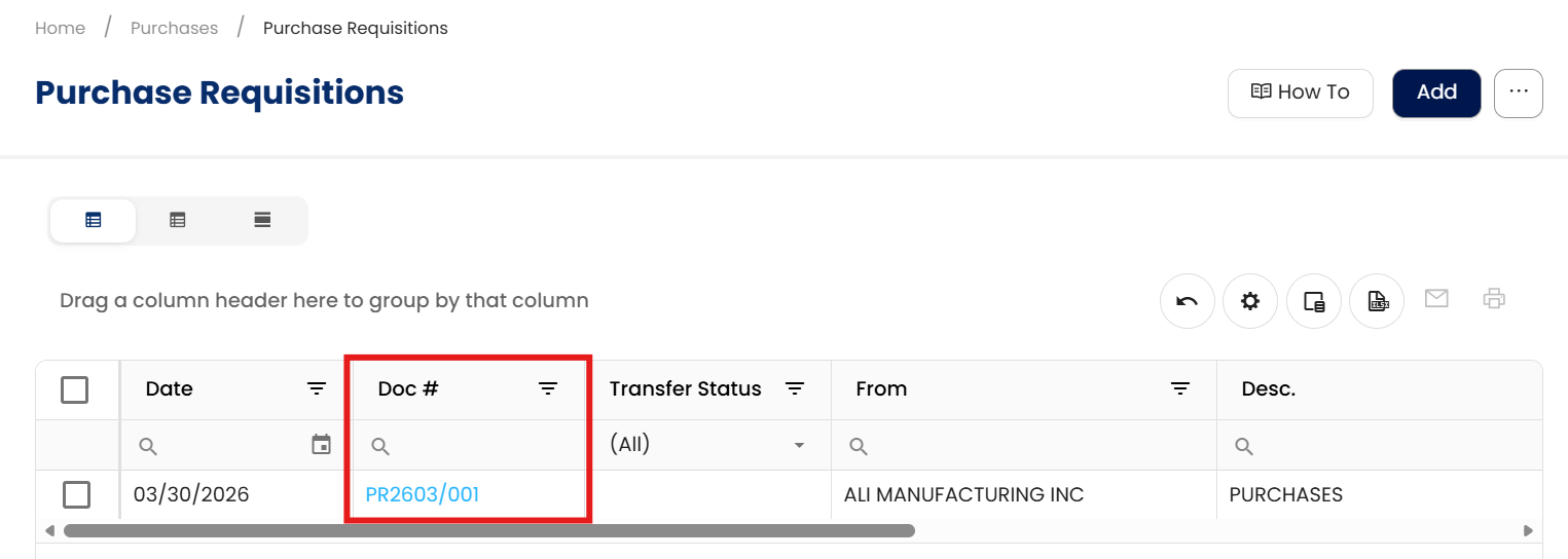 Go to Purchases > Purchase Requisition, then select the Doc # of the Purchase Requisition Record that you want to update.