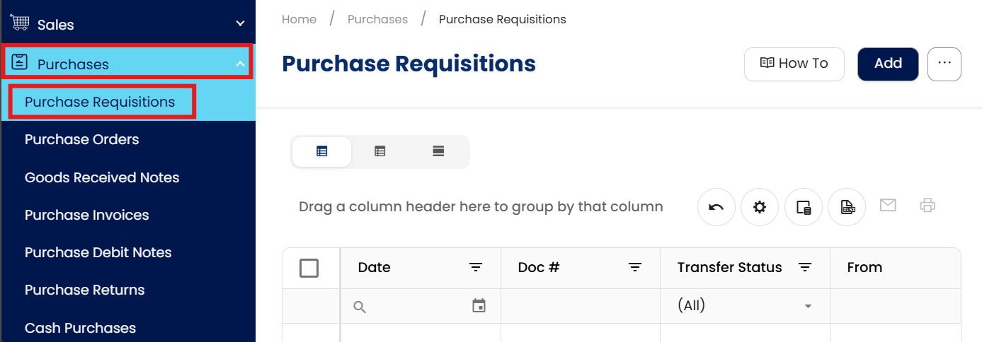 1. In the navigation pane, go to the Purchases> Purchase Requisition > click Add.