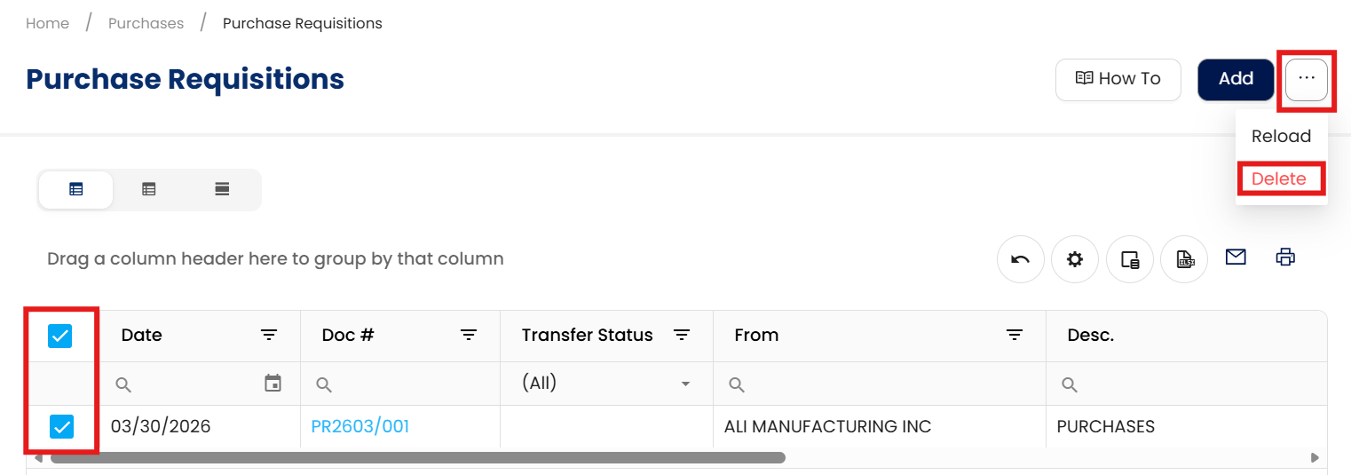 In the Purchase Requisition List View, tick the checkbox beside the item you wish to delete. Hover your cursor over the three dots beside "Add," then click Delete.